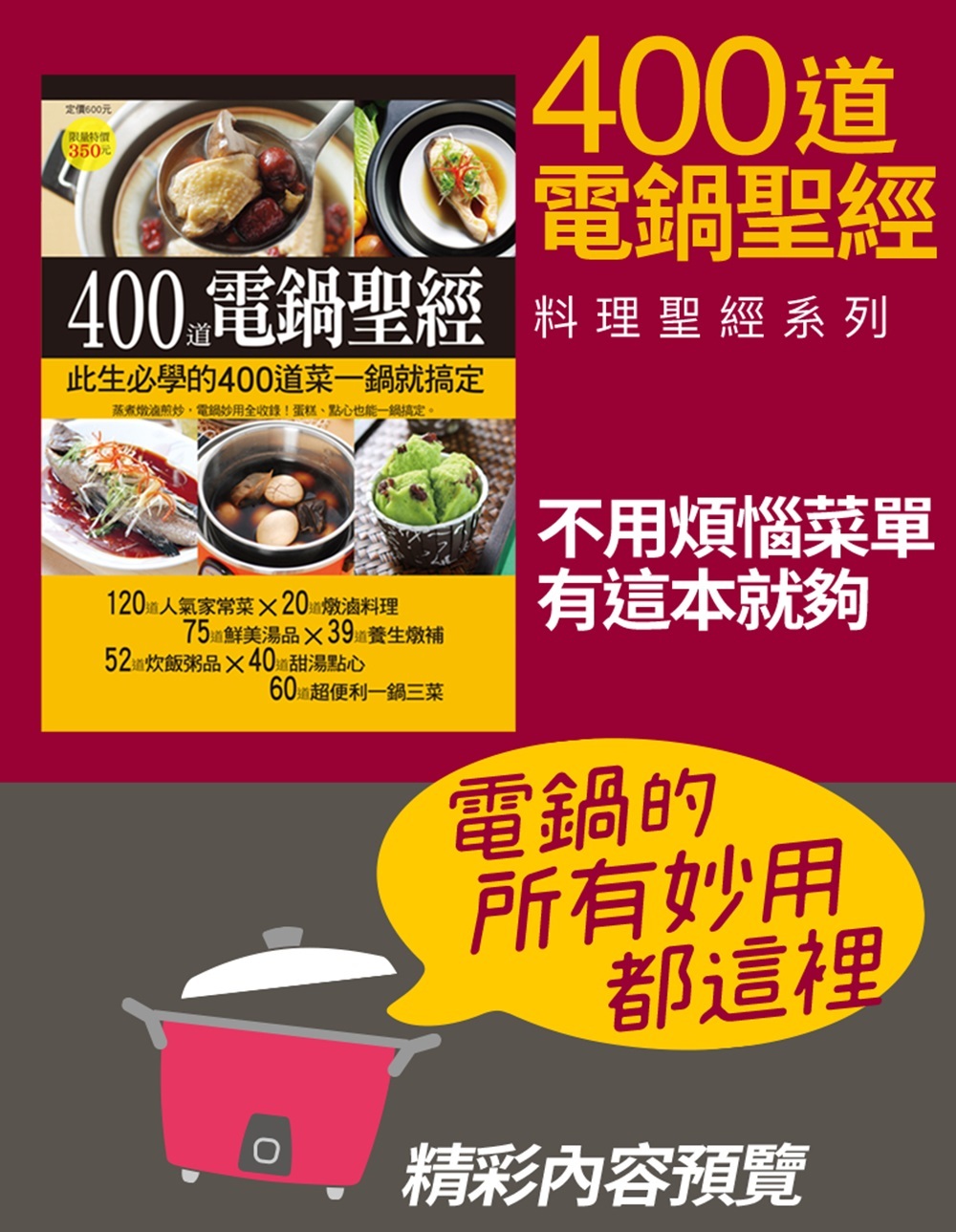 蒸滷煎煮炒燜燉,電鍋的所有妙用這裡都有,400道電鍋料理、美味通通搞定,全都收錄在本書中!