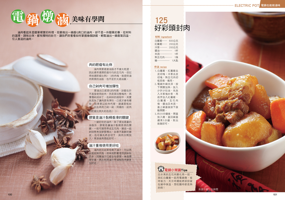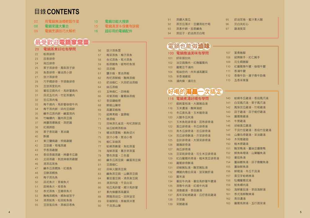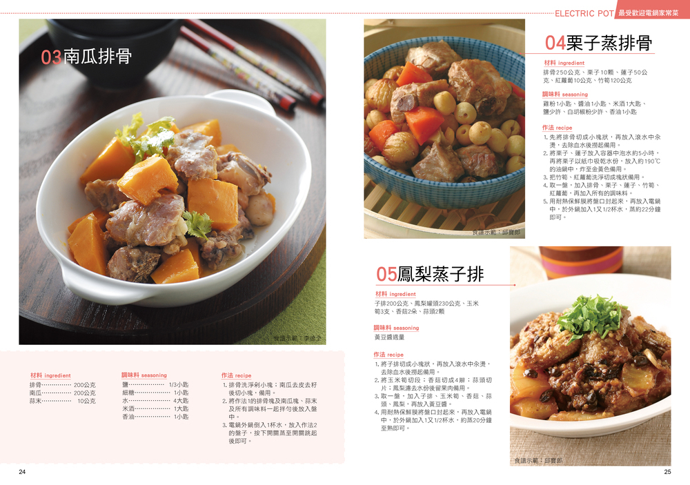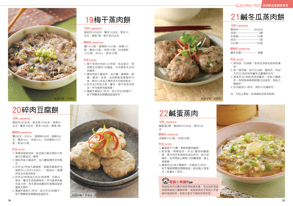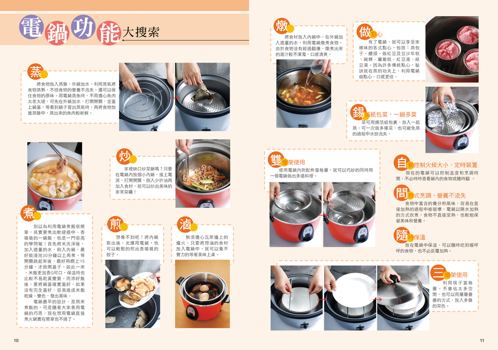 電鍋除了用來蒸菜、燉湯、煮飯之外,你還會用來做什麼?你一定沒想到電鍋還能用來炒菜、煎東西、做點心…,可以說有了一台電鍋,就可以做出一桌菜。用電鍋幾道菜一起蒸、煮,真的省時又方便,只要按下開關,就可等待美食上桌,完全不必操心食物會不小心煮到燒焦!