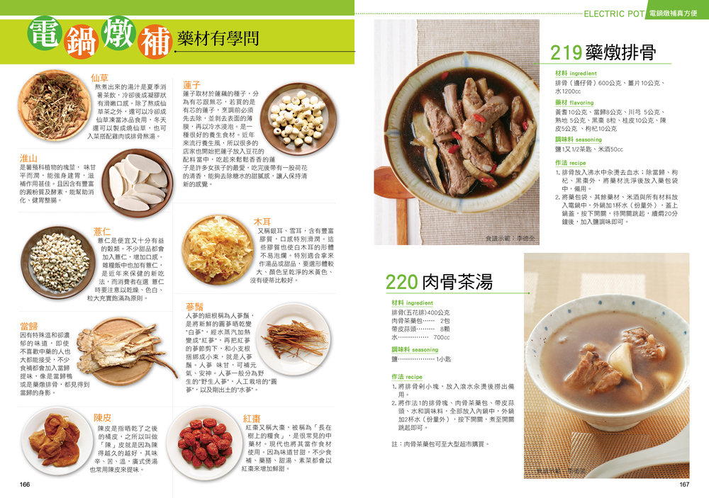 肉骨茶、藥燉排骨、四神湯、當歸麻油豬腰湯、藥膳羊肉爐、當歸羊肉、麻油雞、香菇蔘鬚燉雞翅、杏汁雞湯、牛奶脯雞湯、仙草雞湯、