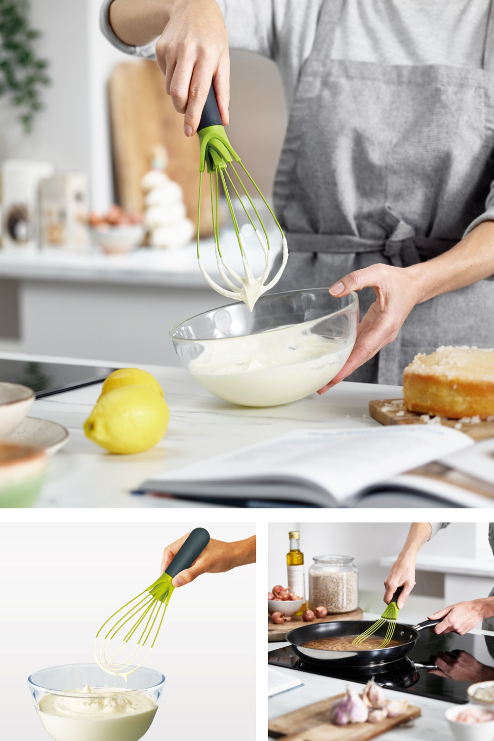 適用不沾鍋具,矽膠耐熱度達攝氏270℃。烘焙食物時,常需要攪打蛋、麵糊、奶油等食材,攪拌器是您不可或缺的餐廚工具。只需輕轉中端鈕,即可將攪拌條由平面翻轉成球狀,方便平面使用攪勻混合鍋中醬料,球狀使用打發奶油、麵糊。矽膠包覆的攪拌條柔軟具彈性,可輕鬆碰觸鍋緣目不易刮傷器皿。