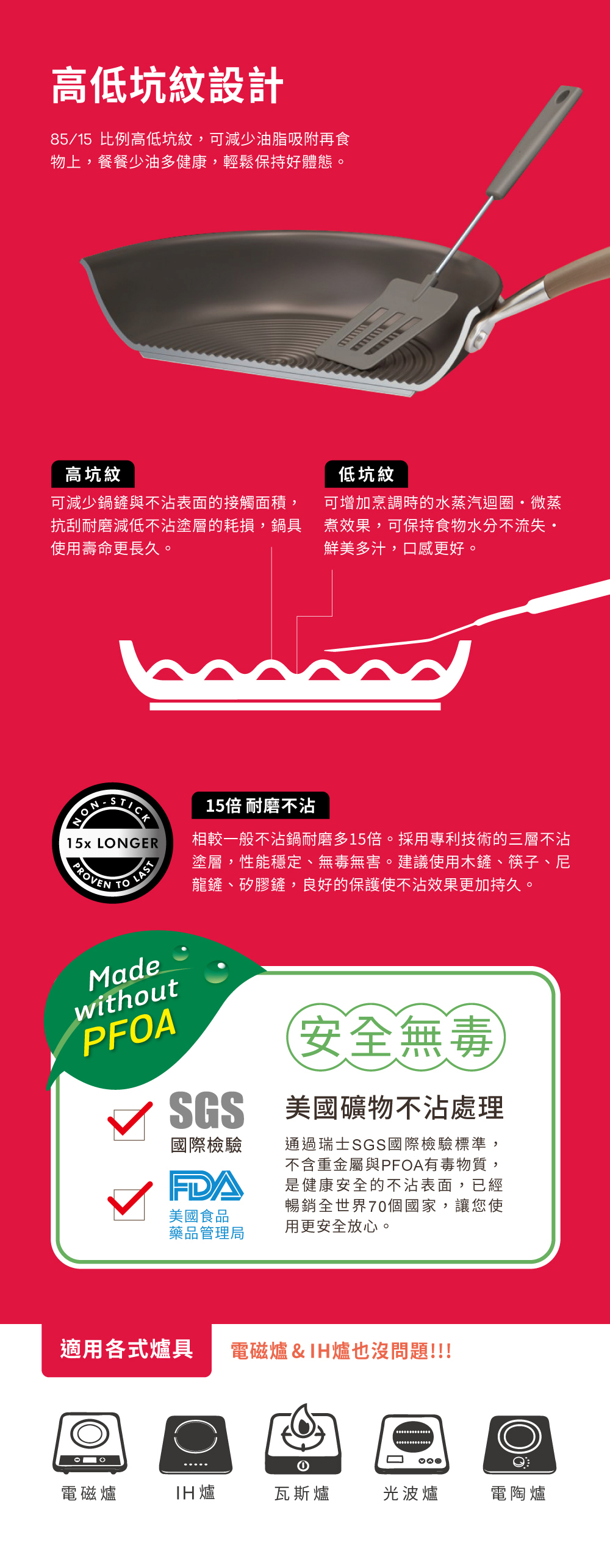 85/15比例高低坑紋,可減少油脂吸附在食物上