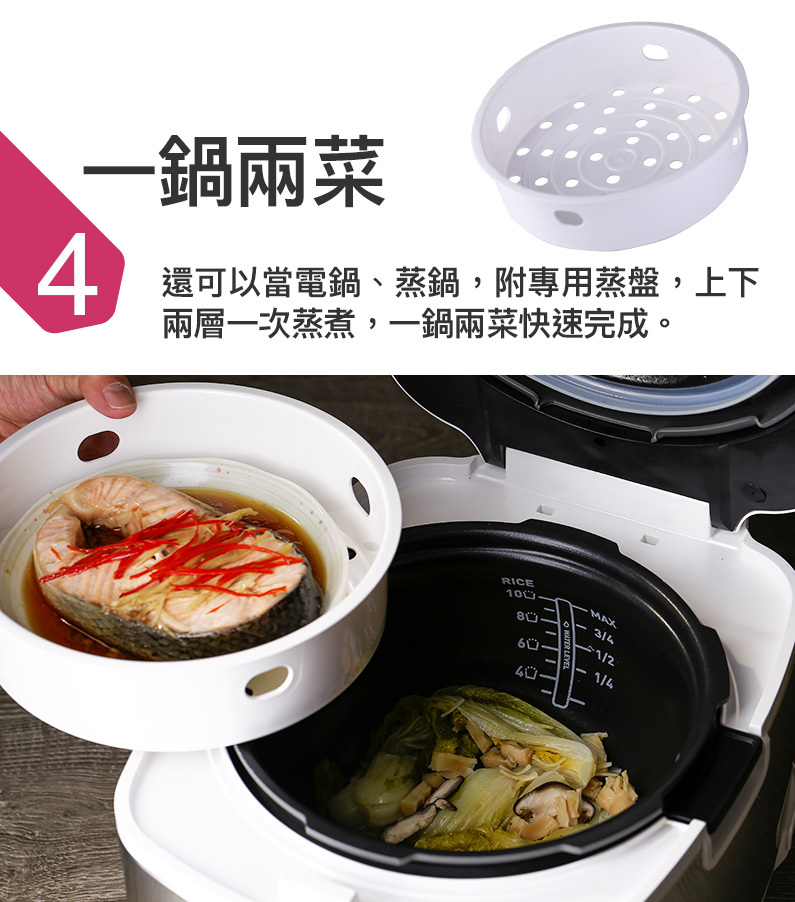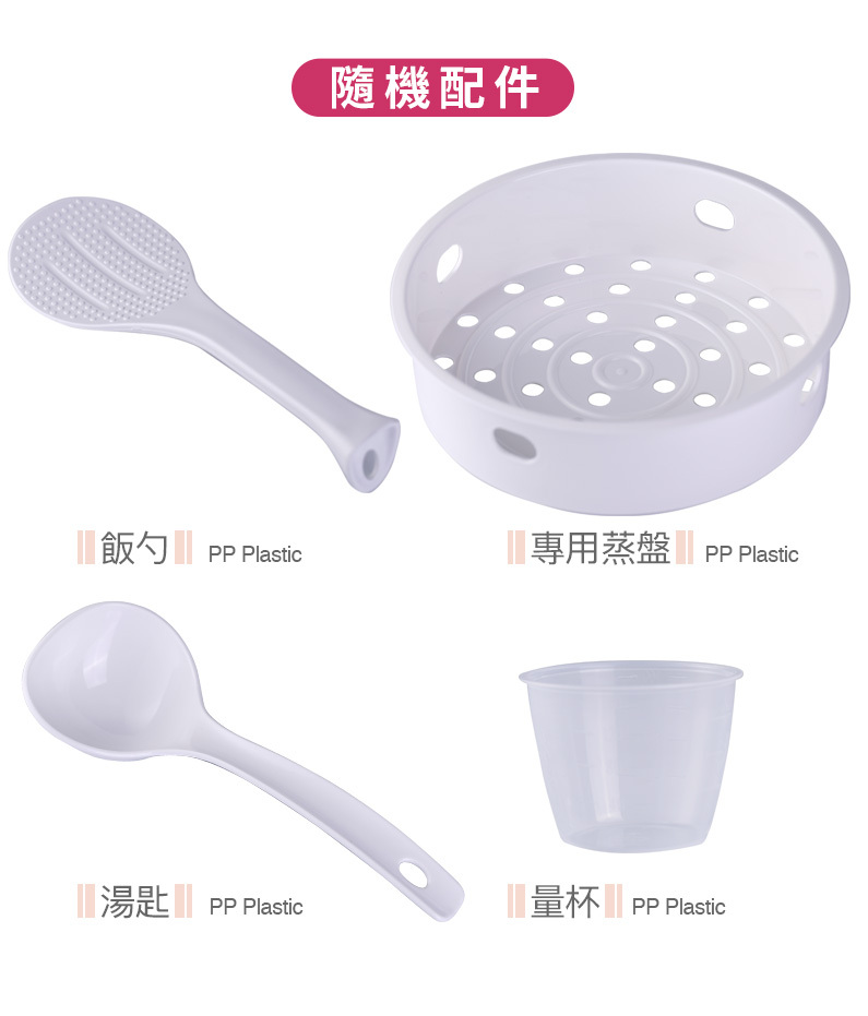 配件:飯勺、專用蒸盤、湯匙、量杯
