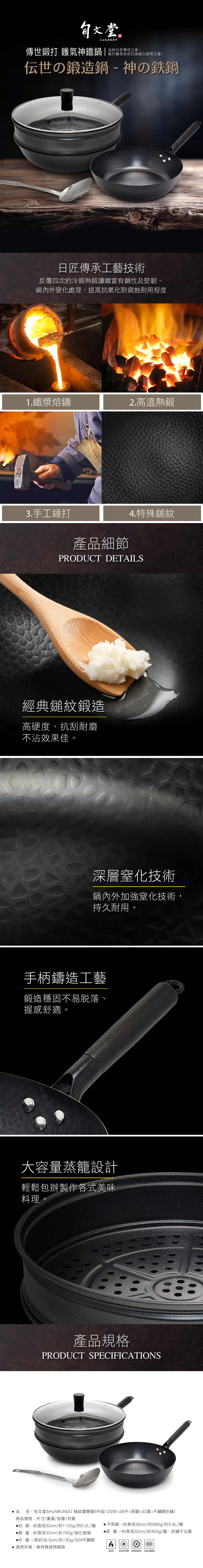 品名:旬文堂SHUNBUNDO槌紋鐵鍋32cm+玻璃蓋+蒸籠 (無彩盒)