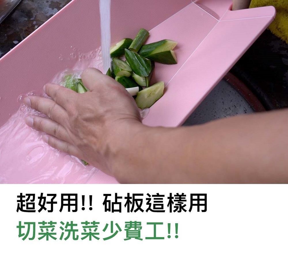 攤平可做為砧板,稍微擠壓把手可形成畚箕型狀,傾倒食材更方便。