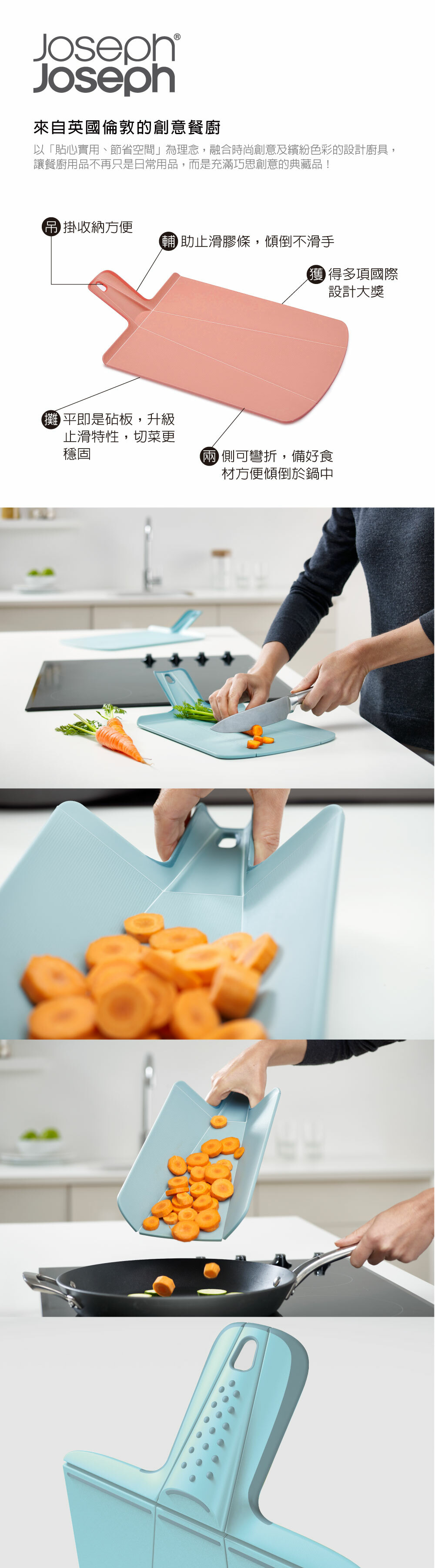 Plus升級了止滑特性,讓畚箕外型的砧板平放切菜時更穩固。
