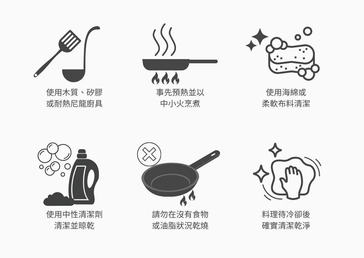 ※ 為保護塗層請使用木質或矽膠鍋鏟,勿使用金屬製品鍋鏟及在鍋內切割或準備食材。