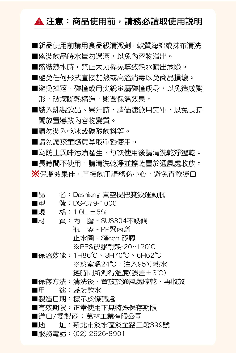 保溫效力:1H 86℃,3H 70℃,6H 62℃(誤差±3℃)