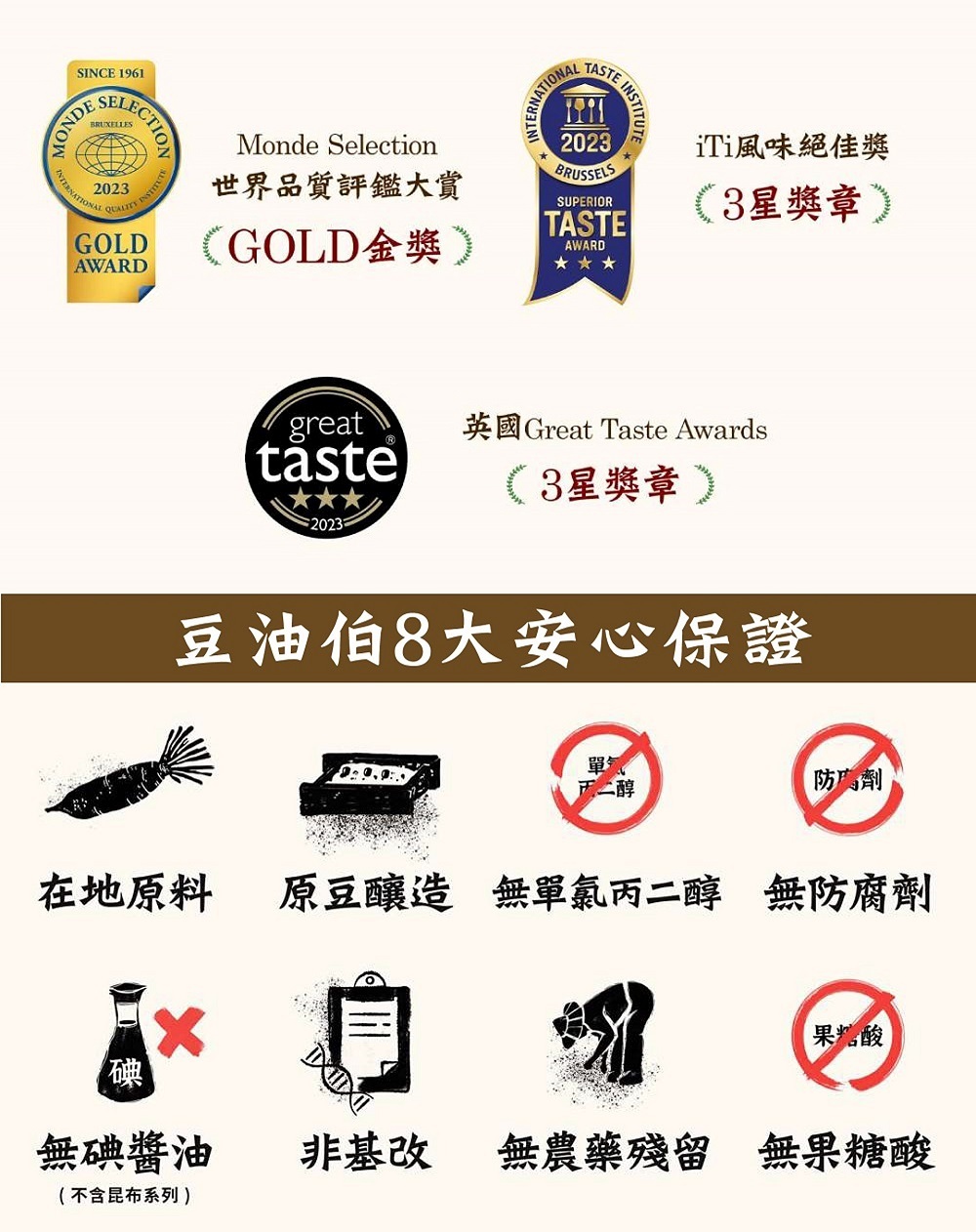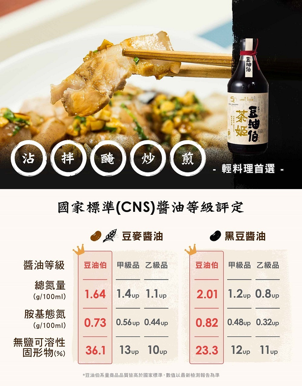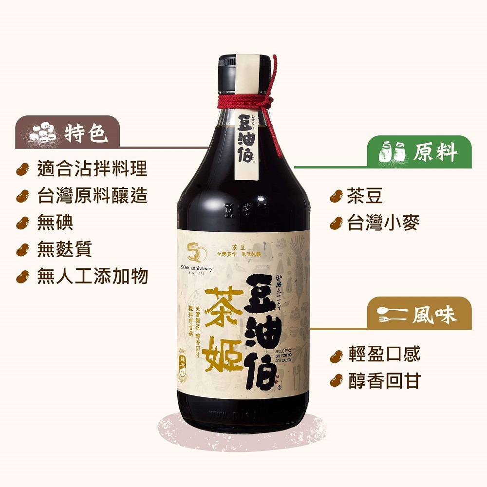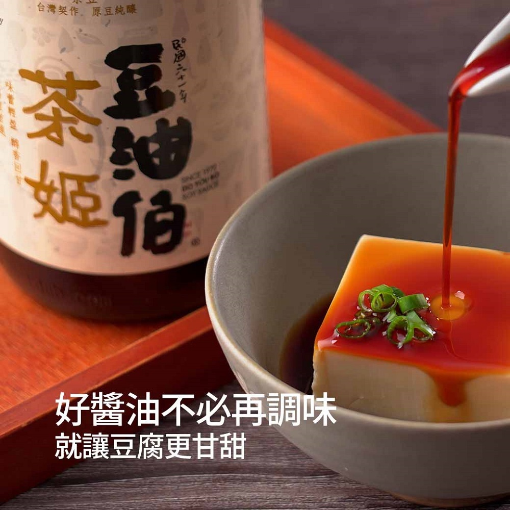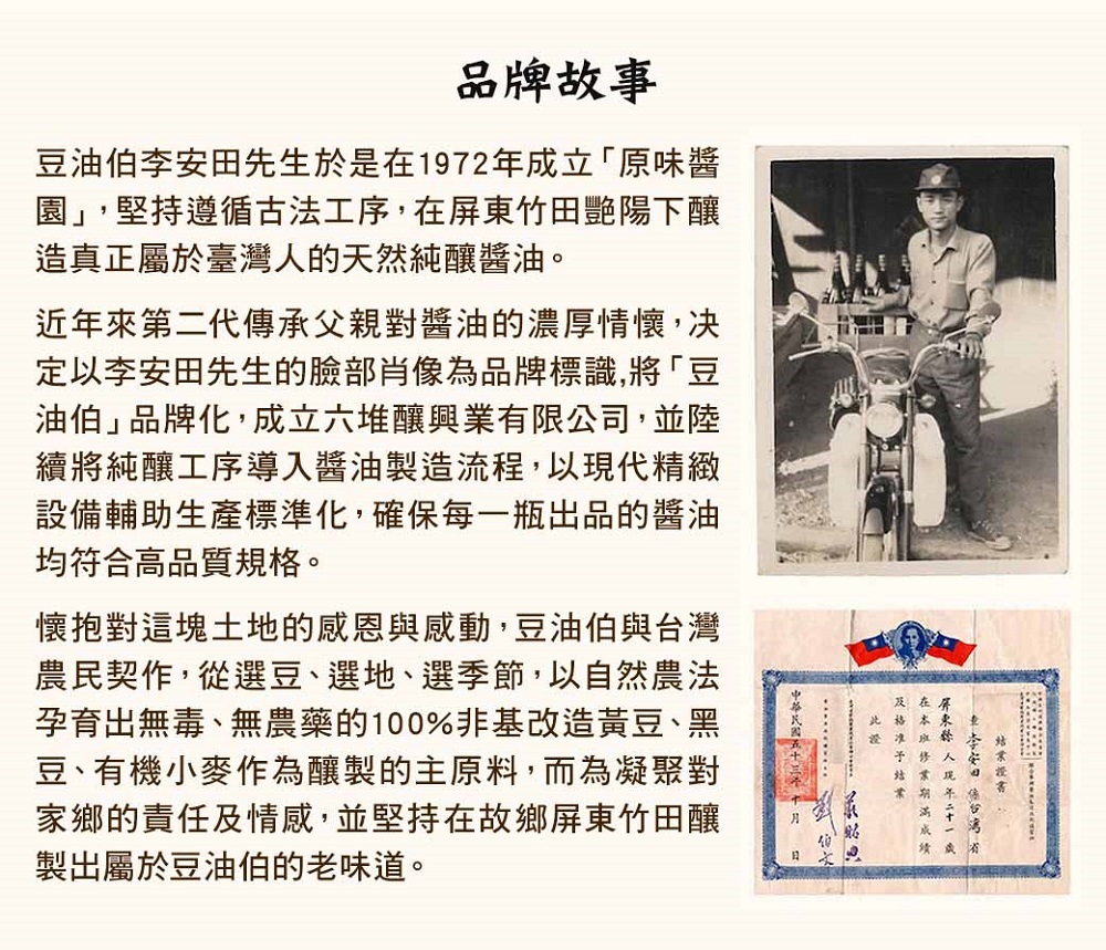 「豆油伯」使用的契作茶豆產區位於高雄美濃,茶豆外表呈咖啡 色,顆粒較傳統大豆小但卻仍飽含豐富大豆元素.在釀造過程中 則因壓榨及過濾等去蕪存菁的工序,將茶豆過多的油脂去除,並 在豆、麥完美比例的搭配下,呈現出極為清爽、輕盈口感的味蕾 體驗.