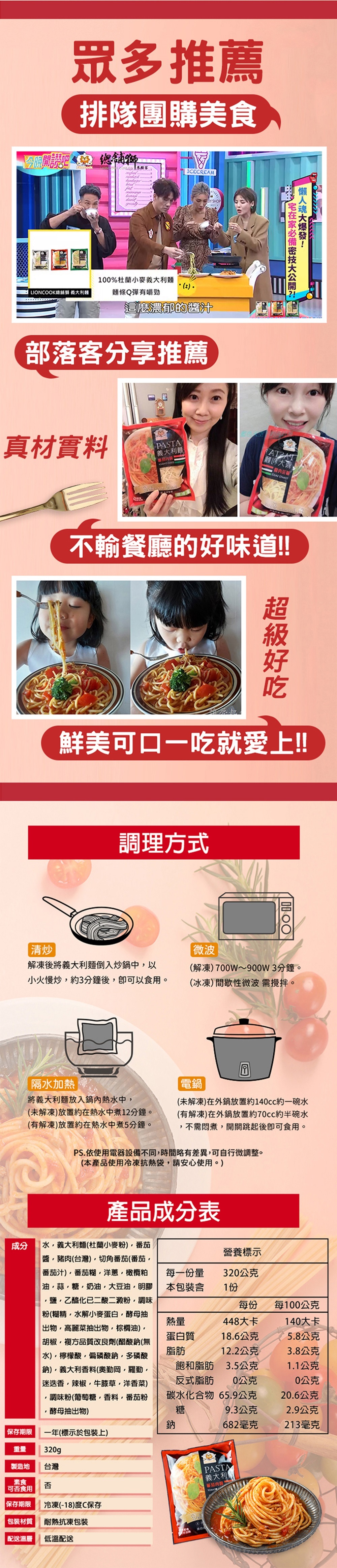 電鍋:(解凍)將義大利麵倒入碗中,外鍋半杯水,不需悶煮,開關跳起後即可食用(或直接將包裝置於內鍋隔水加熱,內鍋清水滿過包裝即可)