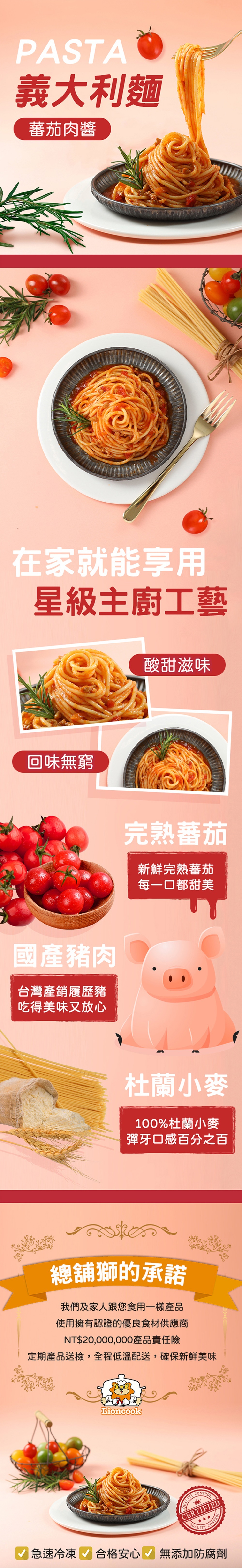經典的風味來自於對傳統的堅持,總舖獅來酷客經典蕃茄肉醬義大利麵,是使用新鮮完熟蕃茄及產銷履歷豬絞肉為基礎,依傳統的作法細火慢燉而成,義大利麵體則是採用100% 較有嚼勁的杜蘭小麥製成,獨家調配的麵醬比例搭配產銷履歷肉末直接拌合,讓麵體與肉醬完美混合,每一根