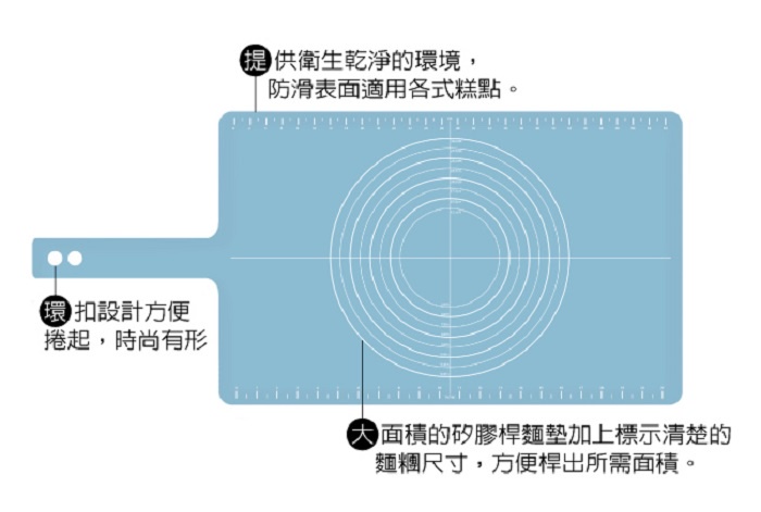 •大面積的矽膠桿麵墊加上標示清楚的麵糊尺寸,方便桿出所需面積