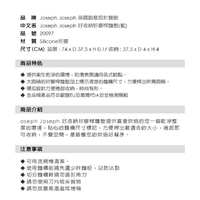 Joseph Joseph 好收納矽膠桿麵墊提供喜愛烘培的您一個乾淨整潔的環境,貼心的麵尺寸標記,方便桿出最適合的大小,捲起即可收納,不費空間,是最懂您的烘培好幫手。