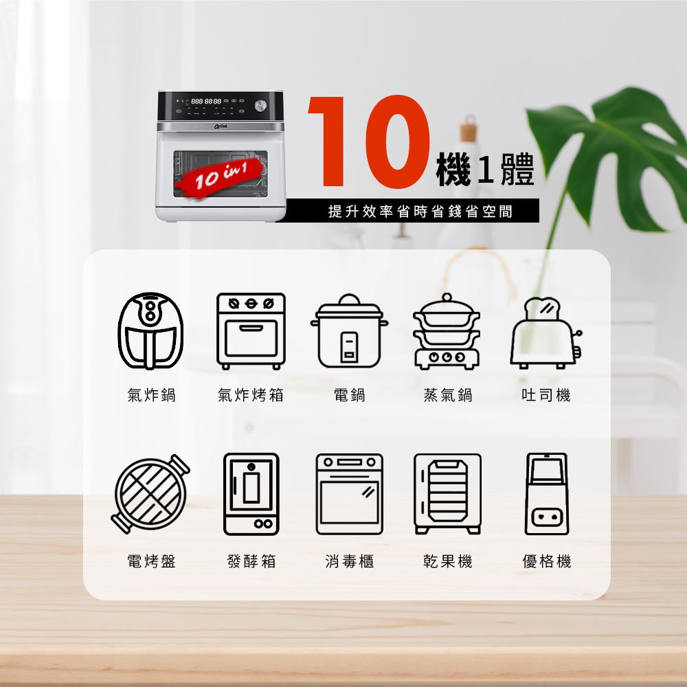 ● 10機一體,擁有一台等於同時滿足氣炸、蒸、烤、發酵、消毒等需求