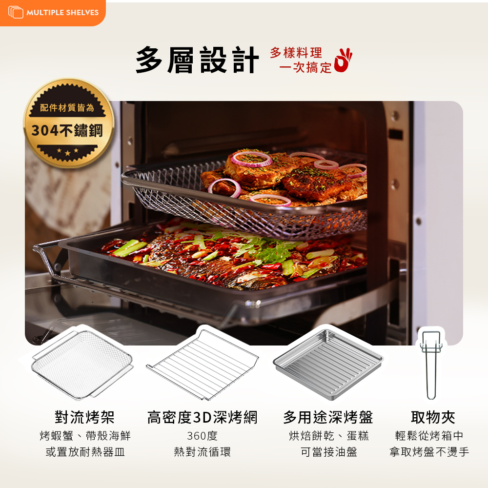 配件 : 對流烤架X1、高密度3D深烤網X1、多用途深烤盤X1