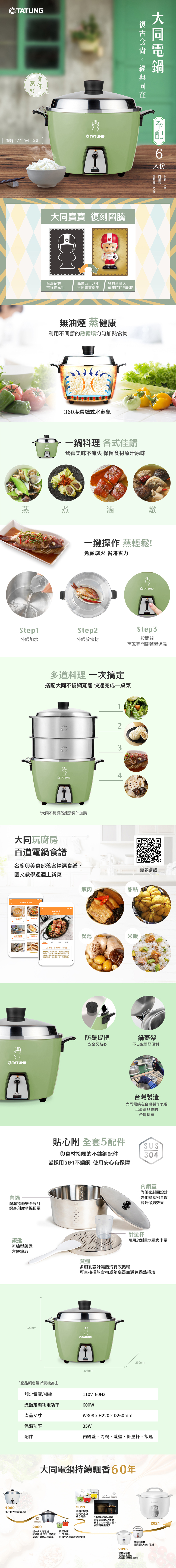 ·鍋蓋、內鍋、內鍋蓋、蒸盤均為SUS 304 不鏽鋼