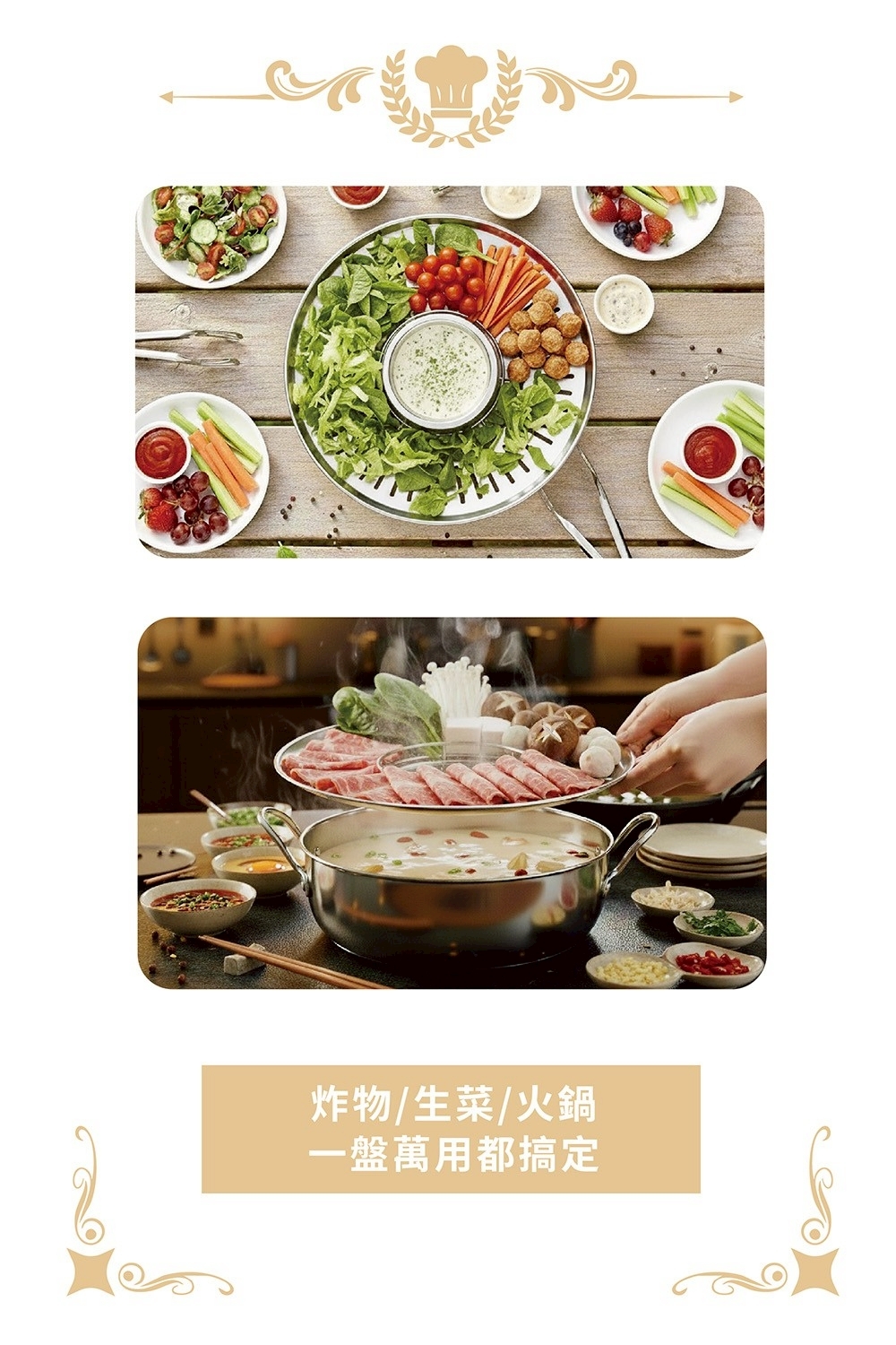 一盤多用:炸雞、天婦羅、生菜涼拌、火鍋撈料,一盤搞定。