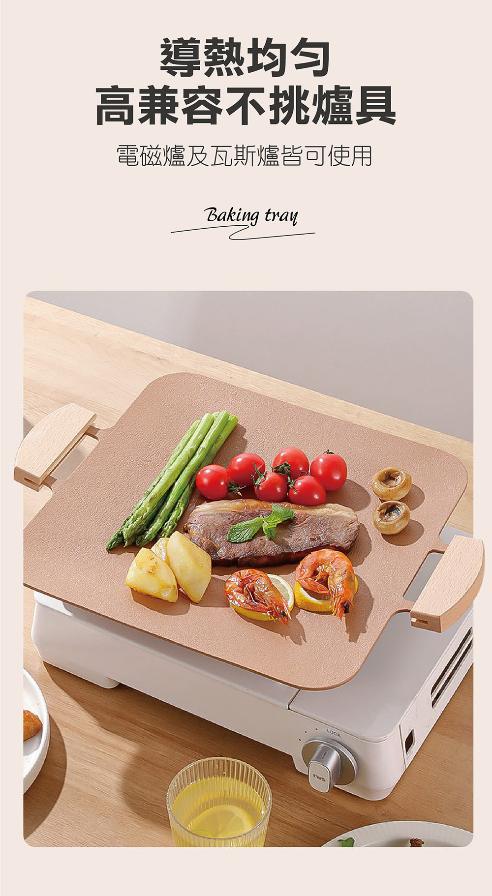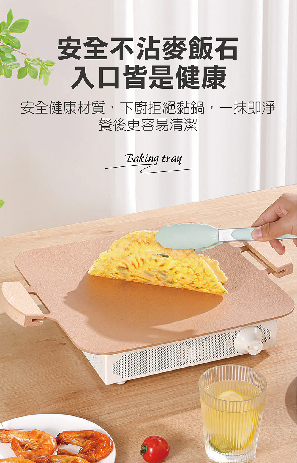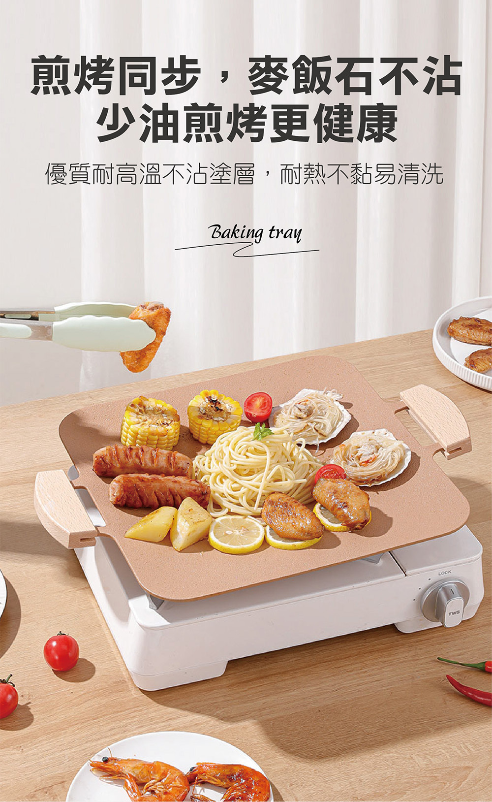 ●煎烤同步,麥飯石不沾,少油煎烤更健康,優質耐高溫不沾塗層,耐熱不黏易清洗。